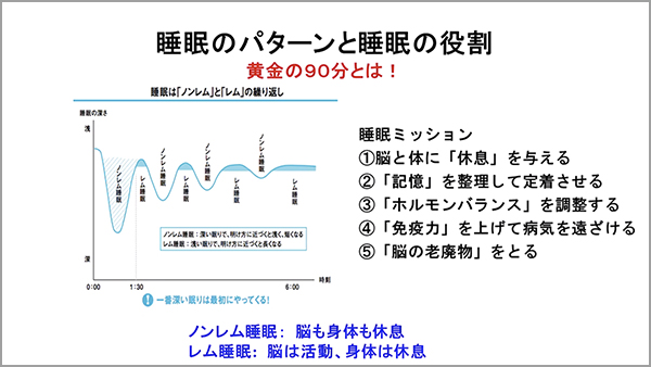まず、記憶を整理して定着させる。睡眠時に成長ホルモンが分泌されることも分かっています。成長ホルモンというと子どもの体の発育に関わるイメージですが、大人や高齢者にも分泌されていて、細胞の修復が行われたり、副交感神経を優位にして体を休めたりします。十分な睡眠をとらないと免疫力が下がり、ワクチンを打っても抗体が十分にできないことも考えられます。また、脳は使えば使うほど脳内に老廃物が溜まるので、その除去も睡眠中に効果的に行われていることが分かっています。ですから、適切な睡眠をとらないとさまざまな疾患リスクが高まります。